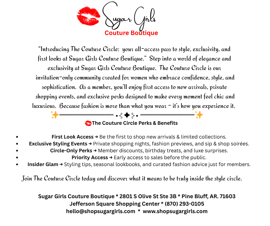 At Sugar Girls Couture Boutique, we believe fashion should be bold, fun, and confidence-boosting. Every piece is hand-picked to help you show up feeling stylish, powerful, and a little extra — because blending in is never the goal. From chic everyday looks to glam statement pieces, we’re here to help you shine, sparkle, and slay your moment the Sugar Girls way 💋