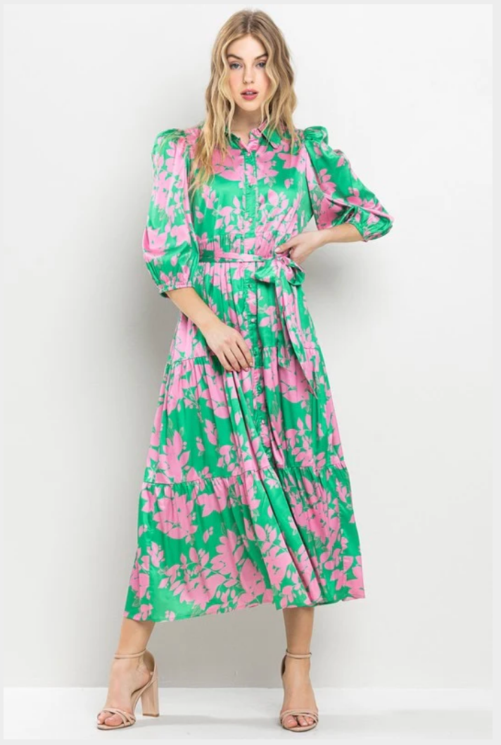 Printed collared midi dress. Featuring a tiered skirt, with a detachable matching belt.